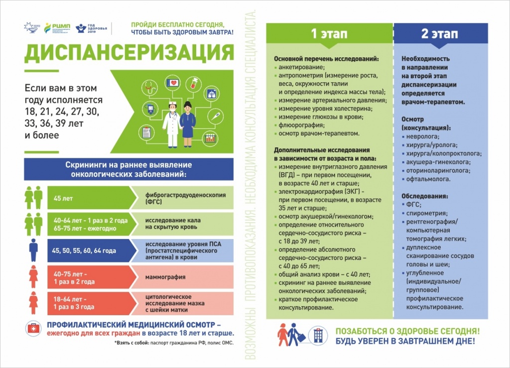 С 1 июня 2019 года в соответствии с Приказом Министерства здравоохранения Российской Федерации от 13 марта 2019 года №124н «Об утверждении порядка проведения профилактического медицинского осмотра и диспансеризации определенных групп взрослого населения» и Распоряжением Министерства здравоохранения Удмуртской Республики от 29.05.2019 года №0632 «О проведении профилактического медицинского осмотра и диспансеризации определенных групп взрослого населения в Удмуртской Республике в 2019 году» диспансеризация определенных групп взрослого населения и профилактические медицинские осмотры будут проводиться по новому порядку. Диспансеризации подлежат граждане в возрасте с 18 до 39 лет включительно один раз в три года( в 2019 году это граждане 2001 ,1998 ,1995 ,1992 ,1989 ,1986 ,1983 ,1980 года рождения) ,и старше 40 лет ежегодно. Профилактические медицинские осмотры проводятся гражданам ,не подлежащим в текущем году диспансеризации. Получить информацию об объемах исследований в рамках диспансеризации и профилактического осмотра можно в кабинете медицинской профилактики №312 ,на сайте БУЗ УР «Алнашская РБ МЗ УР» ,у участкового терапевта ,фельдшеров ФАПов. Все обследования в рамках диспансеризации и профилактических осмотров проводятся бесплатно. В течении одного дня можно пройти Первый этап диспансеризации и профилактические медицинские осмотры в районной больнице.
